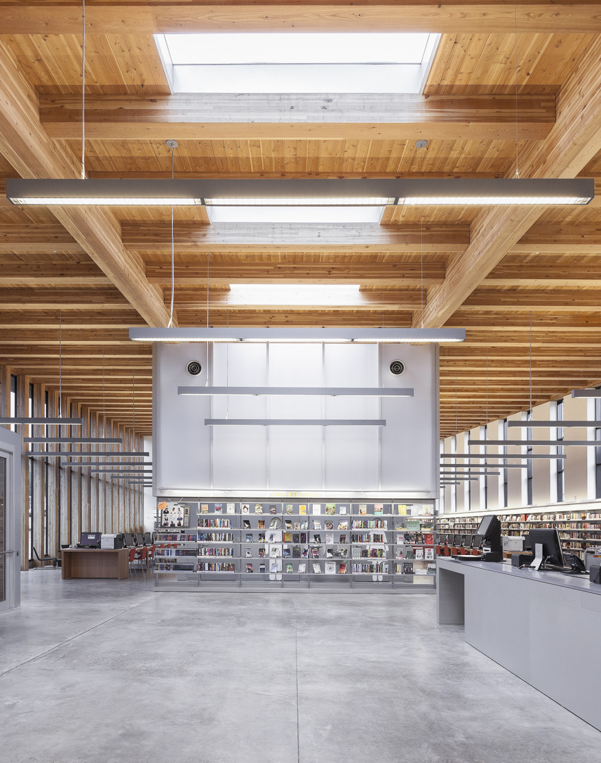 The lighting scheme designed by CBBLD Lighting Design captures the essence of the architecture both in its form and in its material sensibility. CBBLD challenged themselves to see if they could find a single lamp type that could meet the needs of the entire project. “We went around the building looking at what needed to be lit and where we could put the light,” Bernstein says. The CBBLD team decided on a 4-foot T5 linear fluorescent suspended fixtures. (Since the project started in 2009, LED technology wasn’t yet at the forefront of luminaire offerings as it is today.) In the main reading room and community room, the decision translates into a 28W 3000K T5 linear fluorescent direct/indirect pendant that provides 25 foot candles. These luminaires are suspended from aircraft cable and align with the horizontal mullions of the windows and the vertical wood columns of the front curtainwall. The rectangular form of the fixtures complements the shape of the Douglas fir ceiling beams and the fixture’s datum of light becomes another architectural feature. “There isn’t much reliance on over-decoration,” Bernstein says. “The decoration is the palette of materials that were being used. Our lighting had to respond to that, and in its own way had to be an architectural element within the space.”